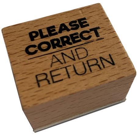 Please Correct and Return Stamp Block: 3.3 cm x 2.8 cm (Design is 2.4 cm x 1.9 cm)
