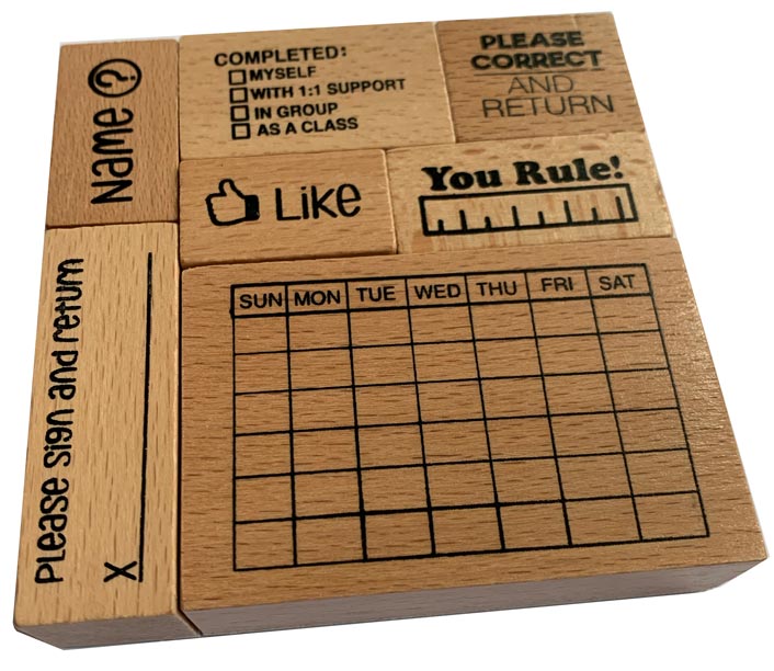 Stamps are quality rubber mounted on durable wooden blocks for a comfortable grip. The block itself is 2 cm in height with the cushion and rubber making the stamp 2.4 cm in height. Designs are printed on the top of the stamp for easy use and identification.